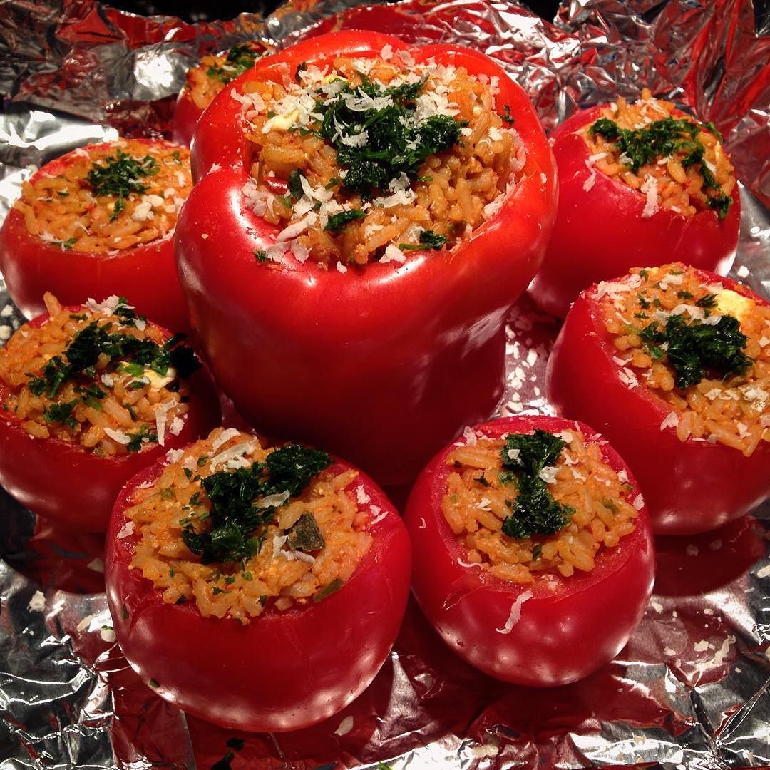 Stuffed tomatoes and bell peppers with rice and feta along with numerous spices.
