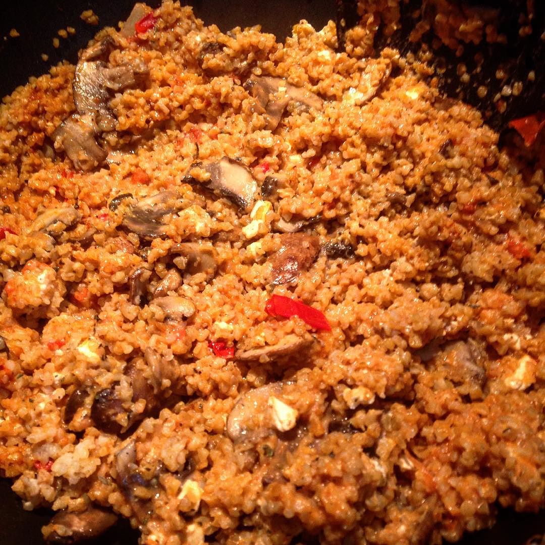 Bulgur, tomato paste, cherry tomatoes, mushrooms, garlic, olive oil, herbs and spices #vegetarian #foodie #bulgur